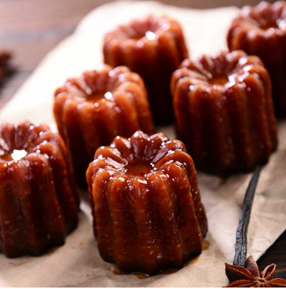 이 제품은 부드러운 커스터드와 누꺼운 카라멜 껍질, 그리고 바닐라 향과 림의 향이 어우러신 프랑스의 과자로 입니다. 까눌레라는 이름은 주름이 있다. 국화모양" 이라는 의미로 12개의 주름이 있는 황동틀에 밀랍 처리를 해서 굽는데요