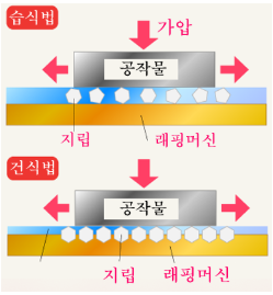 래핑 머신이라고 불리는 평면의 받침대 위에 가공물을 놓고 래핑 머신과 가공물 사이에 지립을 포함한 연마제를 끼워 가공물에 위에서 압력을 가해 연마를 하는 방법입니다.